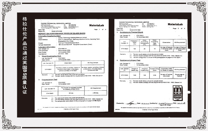 格拉仕倫產(chǎn)品通過了國際質(zhì)量檢測資格的英國(BS)認證、美國(SGS)認證、加拿大(CSA)認證,并由中國境內(nèi)中國人民保險公司承保,并獲得了多項專利。