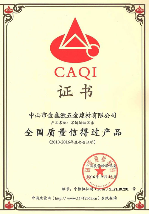 公司不銹鋼淋浴房產(chǎn)品獲得《全國質(zhì)量信得過產(chǎn)品》稱號
