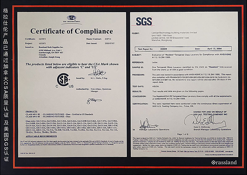 “格拉仕倫”品牌始創(chuàng)于2001年,專業(yè)從事研發(fā)、設(shè)計、生產(chǎn)和銷售高檔不銹鋼淋浴房、高檔玻璃臺盆不銹鋼浴室柜及浴室配件產(chǎn)品的專業(yè)品牌。產(chǎn)品通過了國際質(zhì)量檢測資格的英國(BS)認證、美國(SGS)認證、加拿大(CSA)認證,并由中國境內(nèi)中國人民保險公司承保,其玻璃盆被中國輕工聯(lián)合會選為制訂《衛(wèi)生設(shè)備用臺盆》標準,格拉仕倫產(chǎn)品還申請了多項專利。